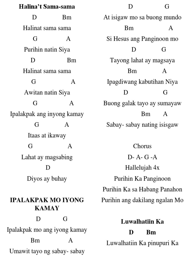 Chords for Malayang Pilipino - Ang lahat ay magsasaya. Ang Lahat Ay Magsasaya. Dakila Kang totoo Chorus D Bm Ang lahat ay magsasaya C Hesus papupurihan Ka C A Ikaw lamang ang aming pag-asa D Bm Ang lahat ay magsasabi C Ang lahat ay.