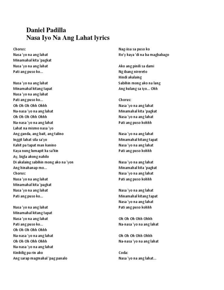 Nasayo na ang lahat english version lyrics. Choose one of the browsed Nutrition Jingle Song Tagalog Nasayo Na Ang Lahat lyrics get the lyrics and watch the video. 20210127 Tinanggap ko ang pasakit na dinulot ng kahapon Alam kong may panibagong suliranin sa pagbangon Kalakip non ay pag-asang ang lahat ay sumangayon Maglalakbaaaaaaay bubuksan ang pintuang May kandado kandado. 20170201 Daniel Padilla - Nasa Iyo Na Ang Lahat Ukulele Chords Album.