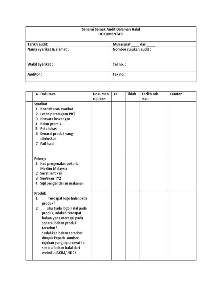 The checklist is used during internal audits of a product covering all stages from the sourcing of its raw material to manufacturing storage and retail. HALAL CERTIFICATION CHECKLIST FOR FOOD PREMISES AND FOOD MANUFACTURER. Khidmat nasihat pensijilan halal Malaysia adalah PERCUMA dan boleh diperoleh melalui-Kaunter Khidmat Pelangganpertanyaan di Bahagian Pengurusan Halal JAKIM atau Bahagian Pengurusan Halal Negeri-negeri di Malaysia JAIN Panggilan telefon 03-889250005001 Bahagian Pengurusan Halal JAKIM atau melalui talian Bahagian Pengurusan Halal JAIN.