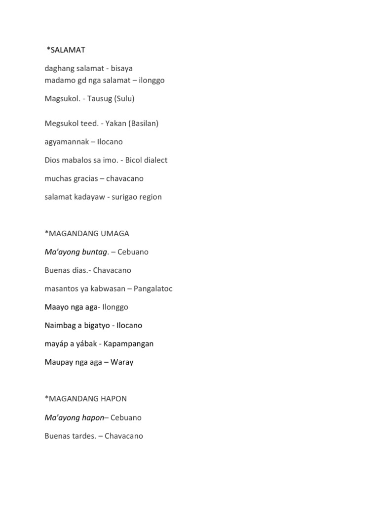 Aug 27 2008 Magandang hapon Tagalog Naimbag a malem Ilocano Mayap gatpanapun Kapampangan Maayong hapon Cebuano Maupay nga kulop Waray Maayo nga hapon Ilonggo Buenos tardes Chavacano -- yes they use Spanish mostly thats all i have. Mayroon din na galing sa salitang Arabo. Mar 31 2019 Magandang hapon sa inyong lahat.