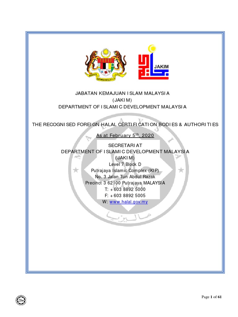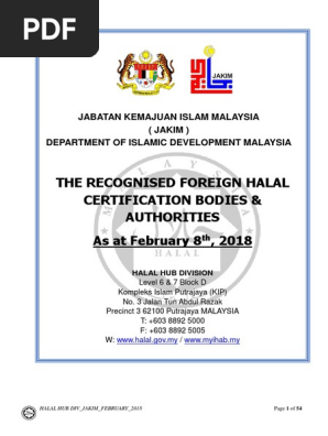 HALAL HUB DIV_JAKIM_SEPT_2017 Page 1 of 54 JABATAN KEMAJUAN ISLAM MALAYSIA JAKIM DEPARTMENT OF ISLAMIC DEVELOPMENT MALAYSIA THE RECOGNISED FOREIGN HALAL CERTIFICATION BODIES. Pr_halalislamgovmy Paparan terbaik dengan resolusi 1024 x 768 piksel dengan pelayar popular seperti. 1 All imported food and goods marketed in Malaysia shall not be described as halal unless the imported food and goods comply with the requirements or certified as halal by the foreign halal certification body recognized by JAKIM.