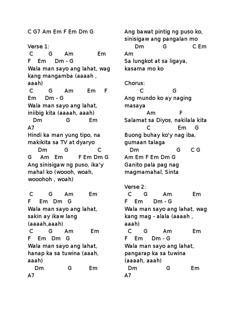 20141015 Wala man sayo ang lahat wag kang mangamba aaaah aaah Wala man sayo ang lahat iniibig kita aaaah aaah Hindi ka man yung tipo na makikita sa TV at sa dyaryo Ang sinisigaw ng puso ikaw ang mahal ko. CHORUS D D7 Wala kang katulad G A Wala nang hihigit sayo D D7 Wala kang katulad G A Wala nang papantay sayo Fm Bm Ikaw ang Diyos noon pa man Fm Bm Maging ngayon G Sa habang panahon A D A7 0 Terms of. Learn to play guitar by chord tabs using chord diagrams transpose the key watch video lessons and much more.