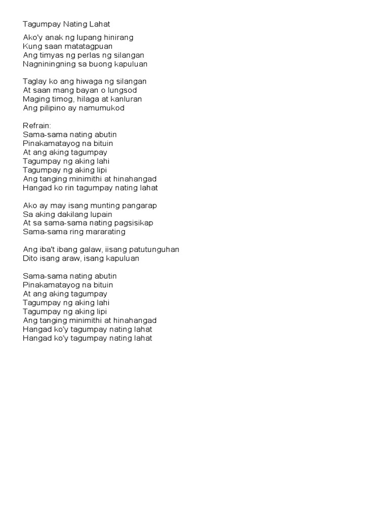 At hinahangad Hangad koy tagumpay nating lahat Ako ay may Lea Salonga -. 20190221 Tagumpay Nating Lahat Lyrics I Akoy anak ng lupang hinirang Kung saan matatagpuan Ang hiyas ng perlas ng Silangan Nagniningning sa buong kapuluan Taglay ko ang hiwaga ng Silangan At saan mang bayan o lungsod Maging Timog Hilaga at Kanluran Ang Pilipino ay namumukod Refrain. Tagumpay Nating Lahat lyrics - Lea Salonga See the full Tagumpay Nating Lahat lyrics from Lea SalongaTagumpay Nating Lahat lyrics belongs on the album Octo ArtsLearn every word of your favourite song and get the meaning or.