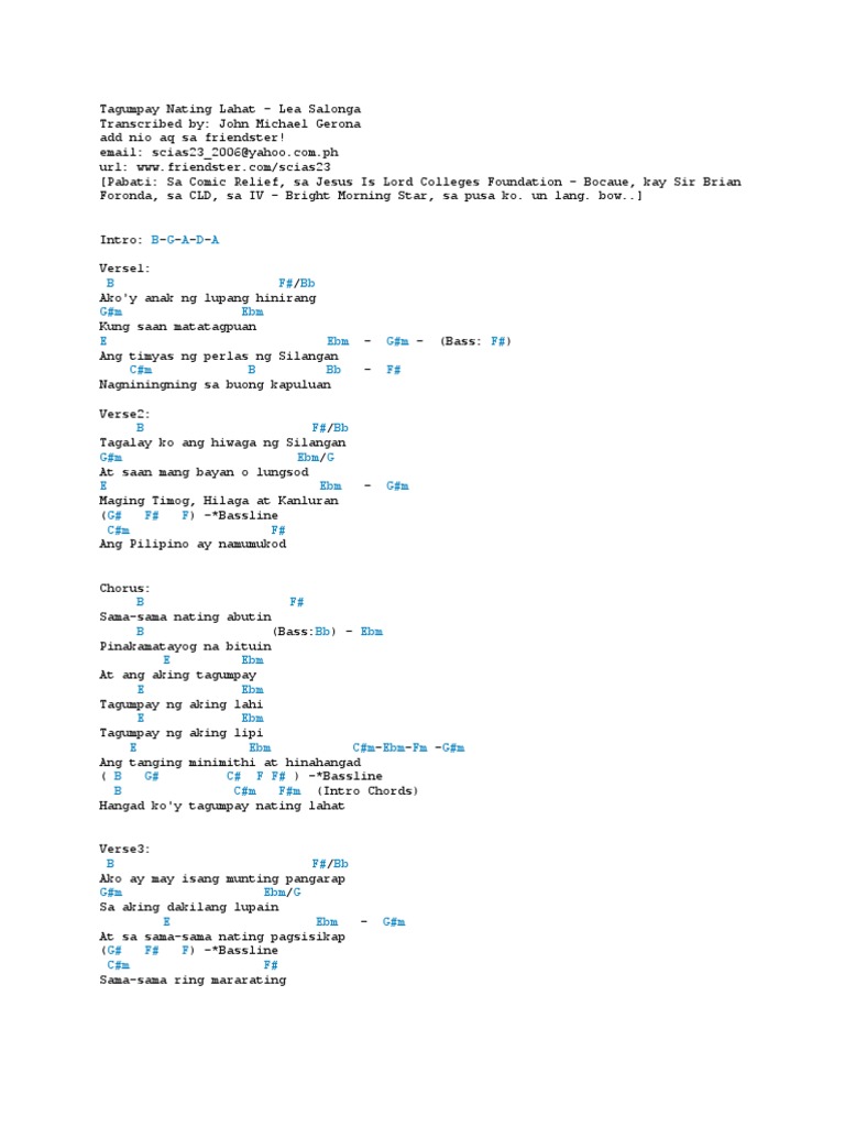 20090101 Lea Salonga Tagumpay Nating Lahat tab Chords. John Michael Gerona. Akoy anak ng lupang hinirang Kung saan matatagpuan Ang timyas ng perlas ng Silangan Nagniningning sa buong kapuluan Taglay ko ang hiwaga ng.