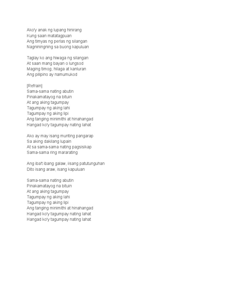 Success is felt sadistic premise be selfconfident. Akoy anak ng lupang hinirang Kung saan matatagpuan Ang timyas ng perlas ng Silangan Nagniningning sa buong kapuluan. Sama-sama nating abutin Pinakamatayog na bituin At ang aking tagumpay Tagumpay ng aking lahi Tagumpay ng.